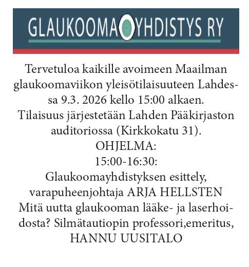 Tervetuloa kaikille avoimeen Maailman glaukoomaviikon yleisötilaisuuteen Lahdessa 9.3. 2026 kello 15:00 alkaen.