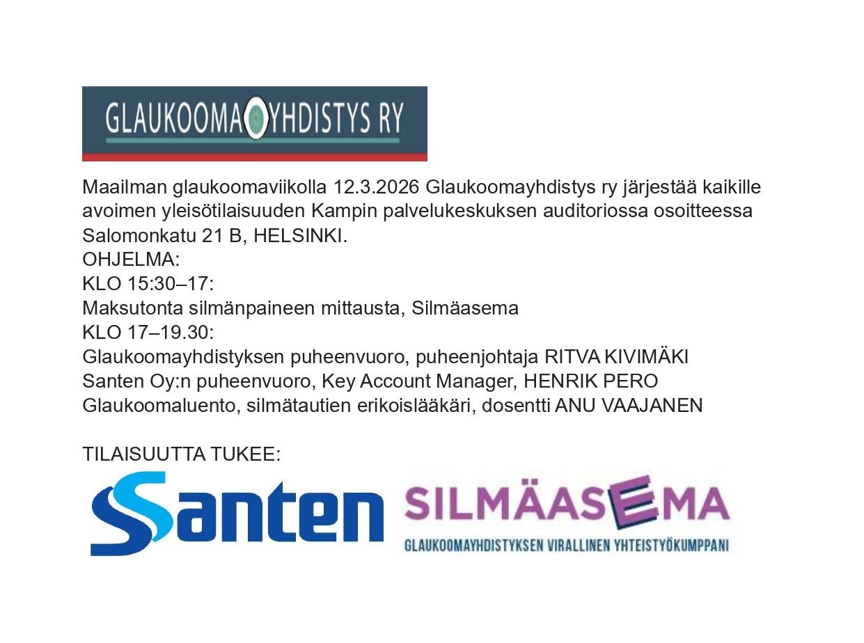 Torstaina 12.3. 2026 kaikille avoin yleisötilaisuus Helsingissä, Kampin palvelukeskuksessa. Ennen varsinaista tilaisuutta maksutonta silmänpaineen mittausta kello 15.30-17.00.